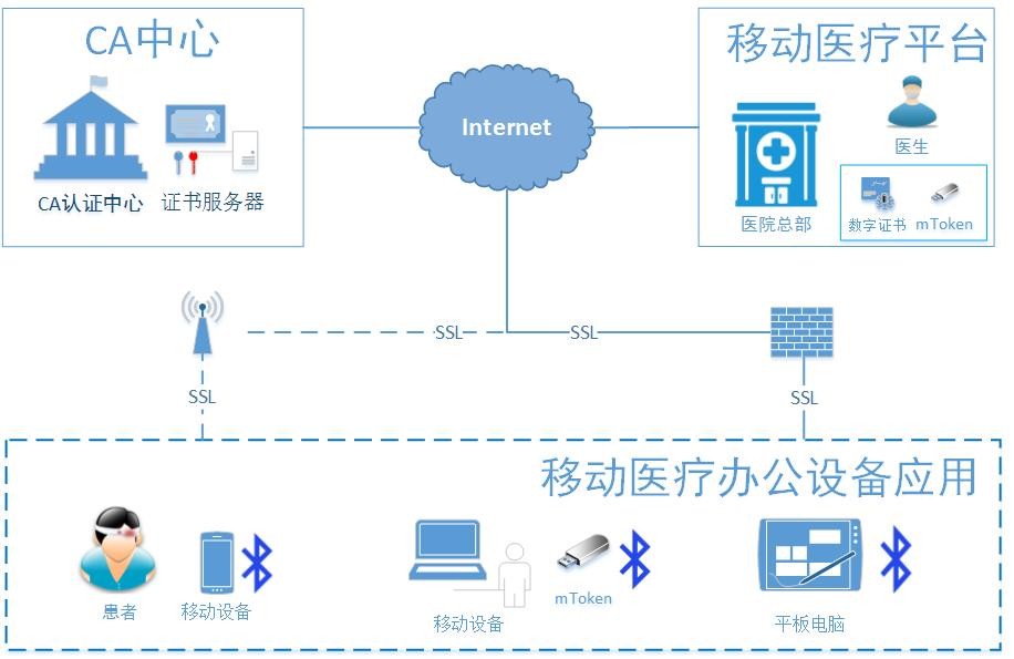 ⊙ 安全架構層以PKI/CA安全體系為基礎,以龍脈科技高強度硬件mToken身份認證鎖作為數字證書的安全載體,無線藍牙K5基于安全無線藍牙通訊,多種加密算法防護,確保各種醫療無線終端如智能手機、平板電腦、移動PDA的安全;
