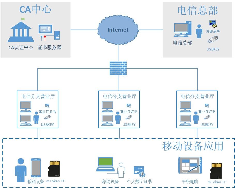 龍脈科技自主設(shè)計(jì)研發(fā)的基于智能卡安全芯片的身份認(rèn)證鎖,mToken USBKEY用于電信總部和營業(yè)廳PC端,mToken TF卡可用于移動(dòng)設(shè)備手機(jī)或者平板使用,實(shí)現(xiàn)高強(qiáng)度的證書安全防護(hù),結(jié)合第三方CA認(rèn)證中心,為電信業(yè)務(wù)系統(tǒng)應(yīng)用提供安全保障,如下圖